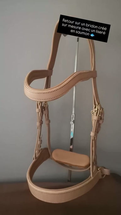 Bridon sur-mesure en cuir naturel, doublure ocre, liseré saumon naturel et couture beige.